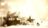 Christmas winter background with gift box, Christmas baubles and fir tree branches on snow.