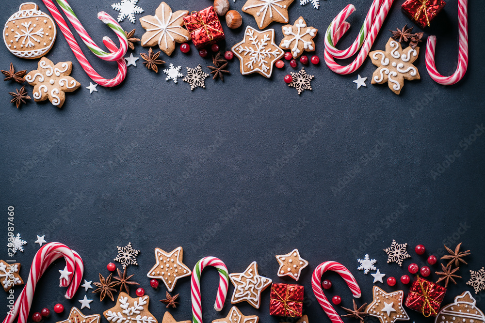 Christmas background, celebration, New Year's eve party concept. Beautiful embellishments, homemade gingerbread cookies and decorations, festive food