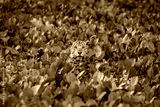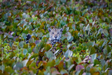 Young Jaguar in a bed of water hyacinths, head and tail visible, facing camera, dawn mood, Pantanal Wetlands, Mato Grosso, Brazil