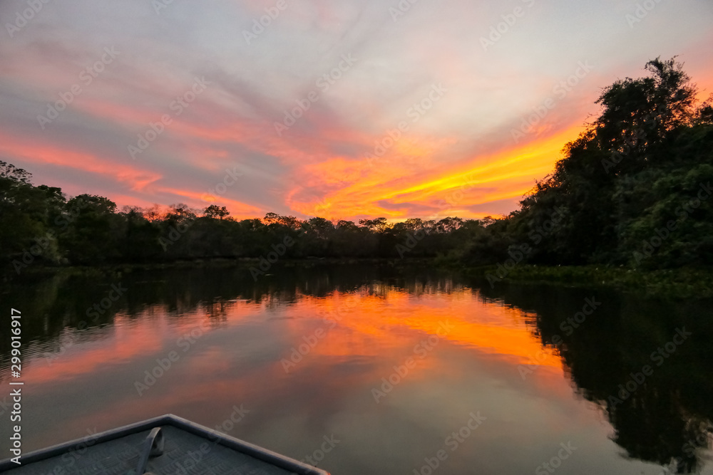 View from boat of wonderful sunset at a Pantanal river with reflections on water, Pantanal Wetlands, Mato Grosso, Brazil