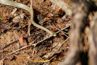 View from above of a Yellow-tailed Cribo snake winding on dirt brown ground, Pantanal Wetlands, Mato Grosso, Brazil