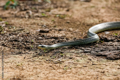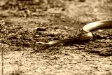 Side view of a Yellow-tailed Cribo snake winding on the dirt brown ground, Pantanal Wetlands, Mato Grosso, Brazil