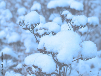 Christmas snow-covered plants scene. Macro. Winter rustic background. Fluffy snow on a dry plant closeup. Sky blue winter landscape.