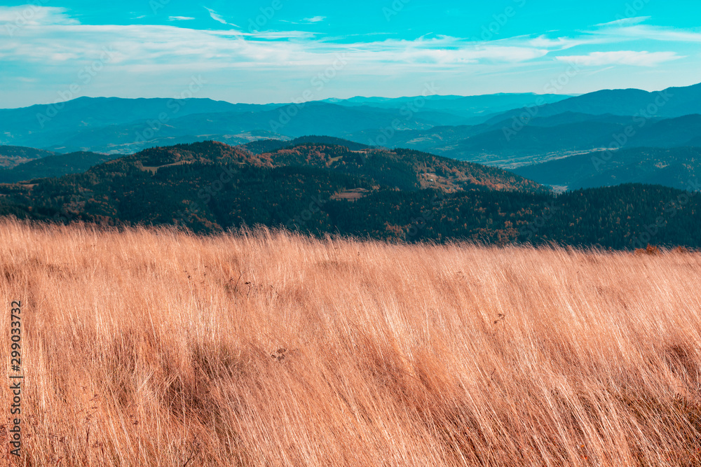 Autumn mountain landscape, high red dry grass on the background of mountains and blue turquoise sky