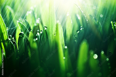 Macro. Background, water drops on the green grass. Desktop background. Selective focus.