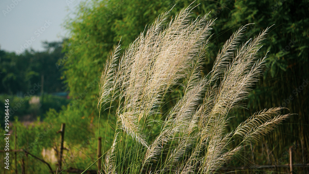 Kashful. Wild sugarcane. Saccharum spontaneum. Kans Grass, locally known as Kashful are seen at full bloom during the Autumn, flowing in the wind like white wave of cloud.