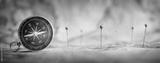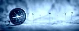 Magnetic compass and location marking with a pin on routes on world map. Adventure, discovery, navigation, communication, logistics, geography, transport and travel theme concept background..