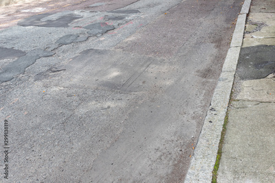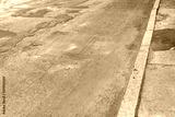 Street and sidewalk in crumbling disrepair, heavily patched asphalt roadway, horizontal aspect