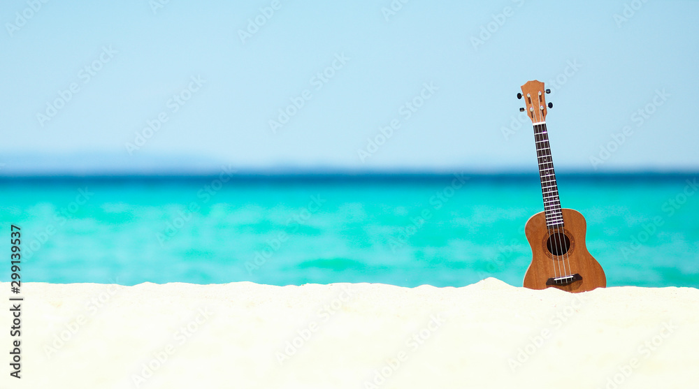 ukulele on the sand by the sea in summer