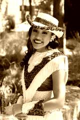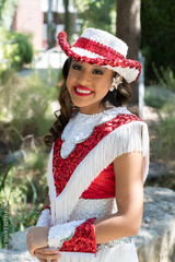Young and beautiful Hispanic high school girl in her school dance uniform posing for school pictures