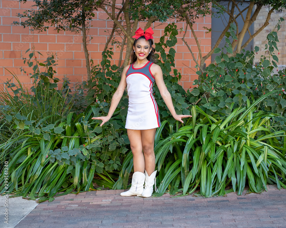 Young and beautiful Hispanic high school girl in her school dance uniform posing for school pictures