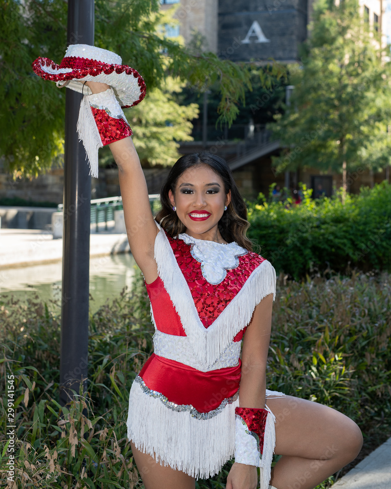 Young and beautiful Hispanic high school girl in her school dance uniform posing for school pictures