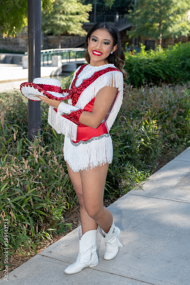 Young and beautiful Hispanic high school girl in her school dance uniform posing for school pictures