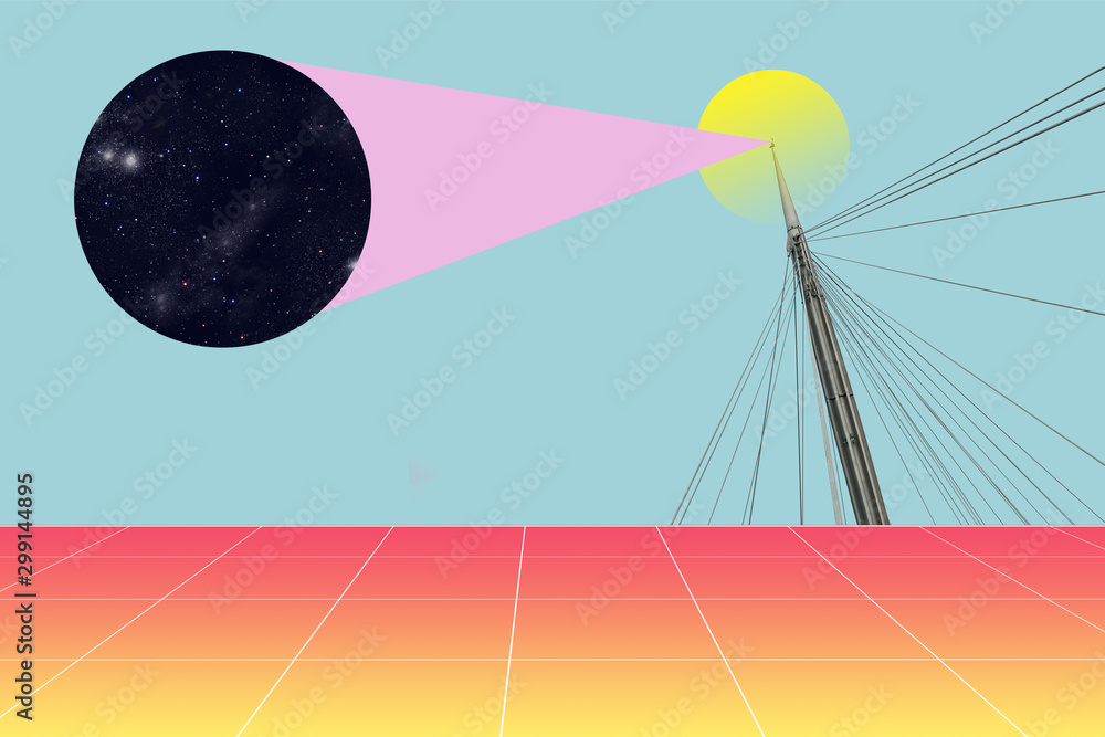 Beautiful abstract surreal landscape antena open portal of space collage concept, contemporary colors and mood social background.