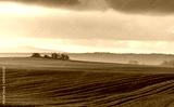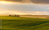 hazy rural evening landscape with golden light and group of trees in the distance. grey hills in the background and field with fresh green in foreground