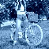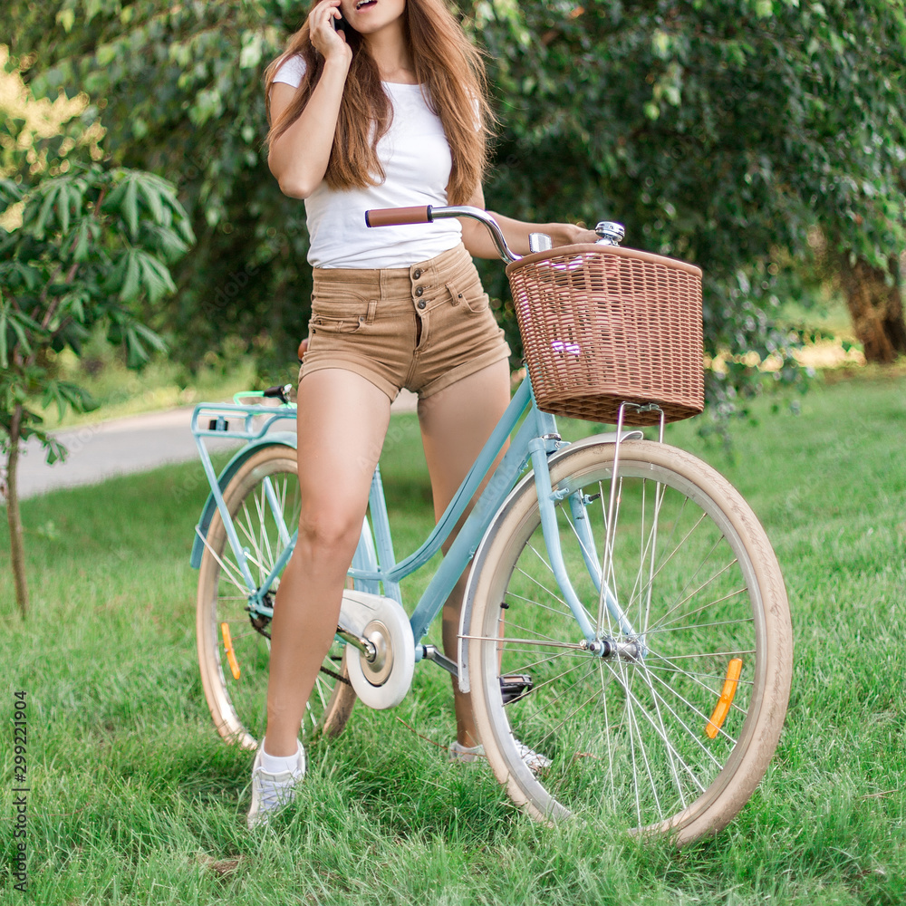 Young pretty woman with vintage bicycle in summer park.