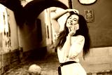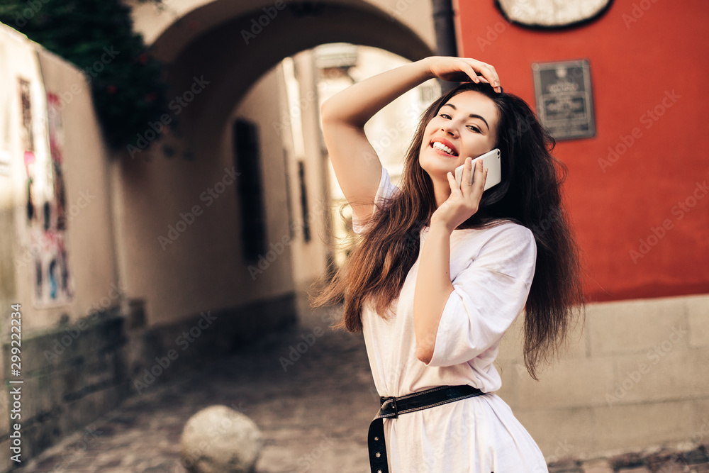 Beautiful woman traveler using phone walking on the old town street.