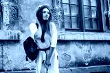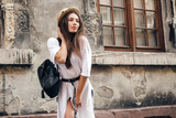 Young stylish woman walking on the old town street, travel with backpack, straw hat, wearing trendy outfit.