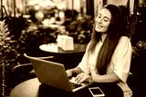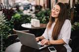 Beautiful woman work on laptop and using phone sitting in street cafe.
