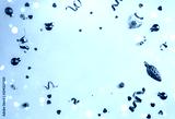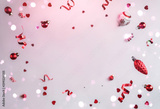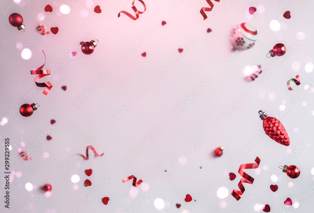 Merry Christmas card made of flying decorations, red decor, balls, sparkles and confetti on light pink background. Xmas and New Year holiday, bokeh, light. Selective focus