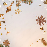 Creative frame made of flying Christmas decorations, gold fir branches, balls, snowflakes, sparkles and confetti on light gold background. Xmas and New Year holiday, bokeh, light. Selective focus