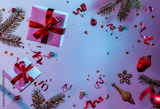 Christmas card made of flying decorations, gift boxes, fir branches, balls, sparkles and confetti on colorful neon blue and purple background. Xmas and New Year holiday, bokeh, lights. Selective focus