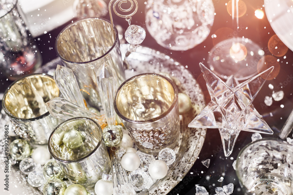 Christmas table place setting with christmas pine branches, cones, decorations with blurred, sparking, glowing. Happy New Year, toning