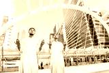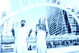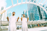 Two young man Asian Muslim praying in city background, Asian student leaning education and activity concept