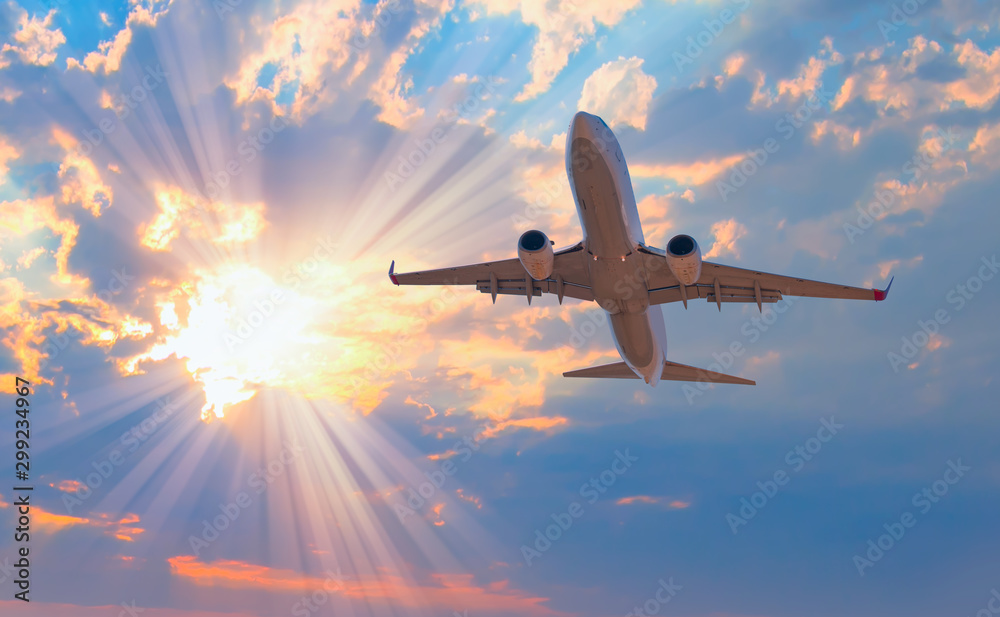 Commerical airplane in the sky at sunrise
