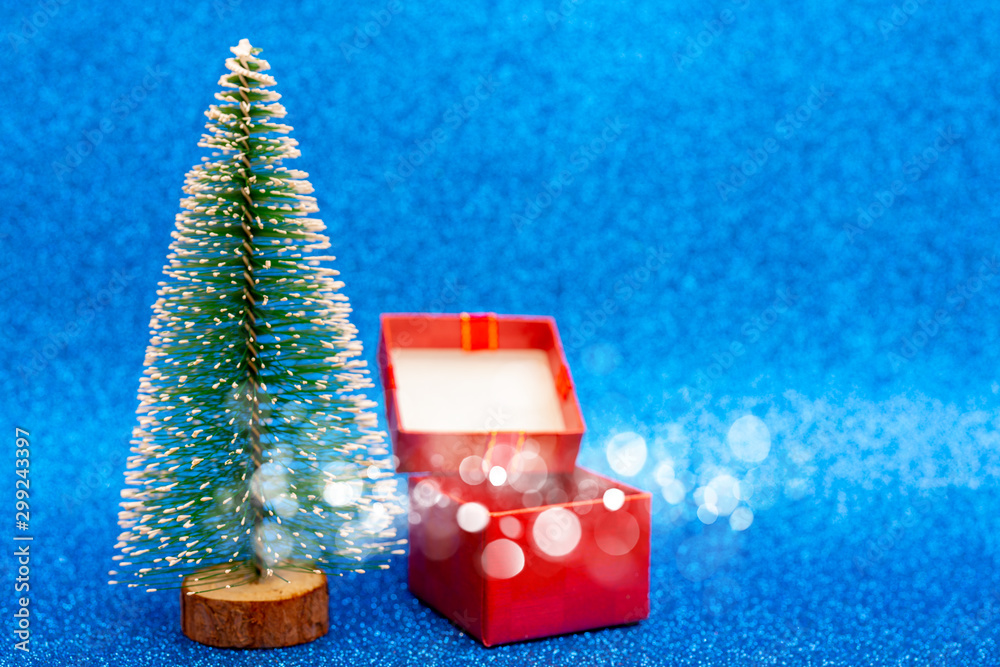 Christmas tree and gift box. Festive christmas background.