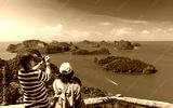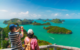 Couple traveler on top of island joy view beautiful amazed nature scenic landscape, Adventure lifestyle landmark tourist travel Samui Thailand summer holiday vacation, Tourism destinations place Asia
