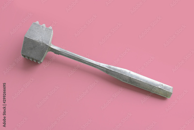 Kitchen utensils - a hammer for beating meat on a pink background. Tools for cooking raw food.