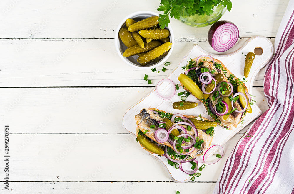Traditional Dutch sandwich with herring and pickles cucumbers on white table. Smorrebrod.Top view