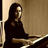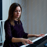 Young woman sitting and playing on the electronic piano