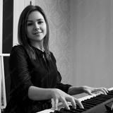 Young woman sitting and playing on the electronic piano