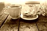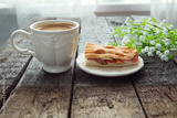 Apple pie and cup of coffee with flowers on table