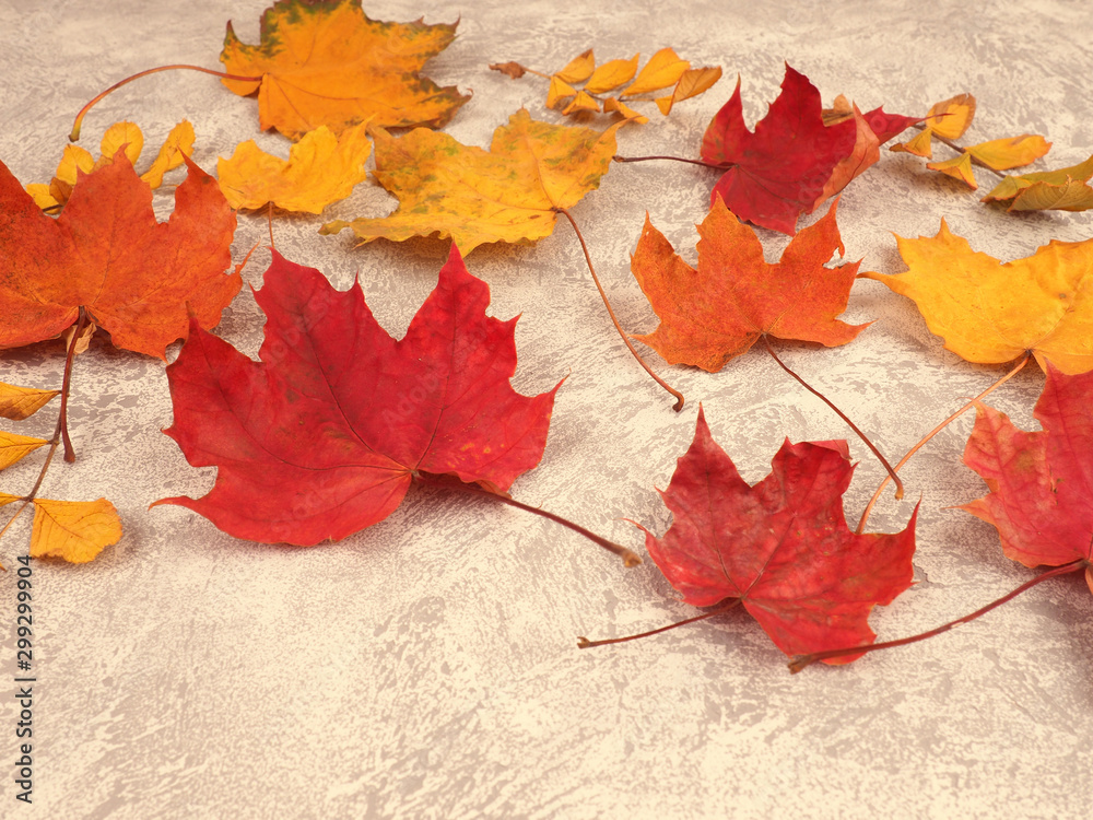 autumn composition. yellow maple leaves on a concrete background, as a substrate for a postcard