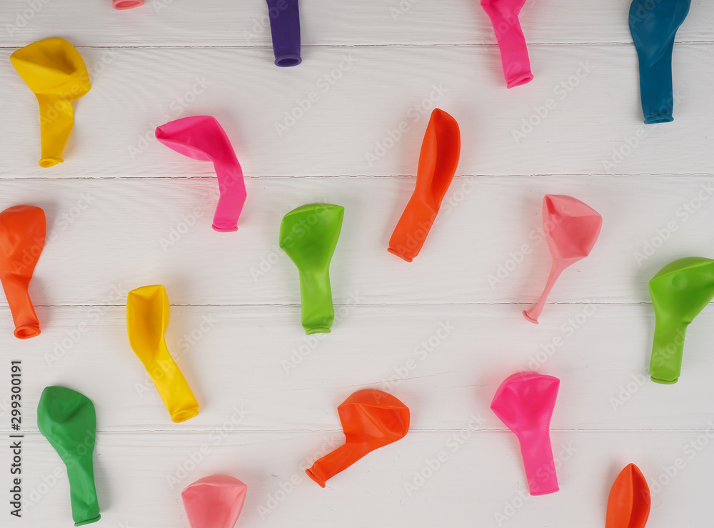 a lot of colorful balloons not inflated by air on a white background as a substrate and the idea of a holiday and fun