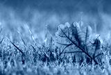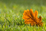 Yellow oak leaf on morning dew wet green grass in the sunlight, Autumn scene background