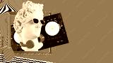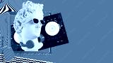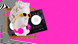 Apollo in headphones and sunglasses on a pink background. Concept art collage. Poster design.