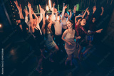 Top above high angle photo of crazy cheerful students corporate company want celebrate mate birthday visit nightclub enjoy music dance scream have fun party wear formalwear dress
