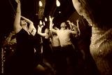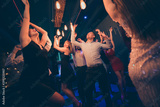 Portrait of positive cheerful people students have fun celebrate fest festive event go discotheque dance feel crazy rejoice wear formalwear dress in nightclub