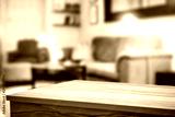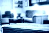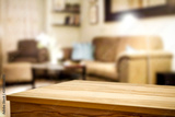 Wooden corner table background of free space for your decoration and blurred home interior