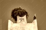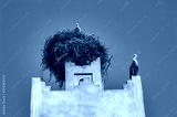 Storks nesting on old Moroccan monuments with blue sky