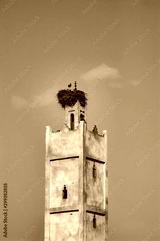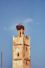 Storks nesting on old Moroccan monuments with blue sky