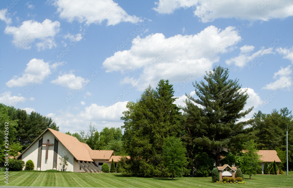 Modern Church A Frame Roof, Lawn, Trees, Blue Sky