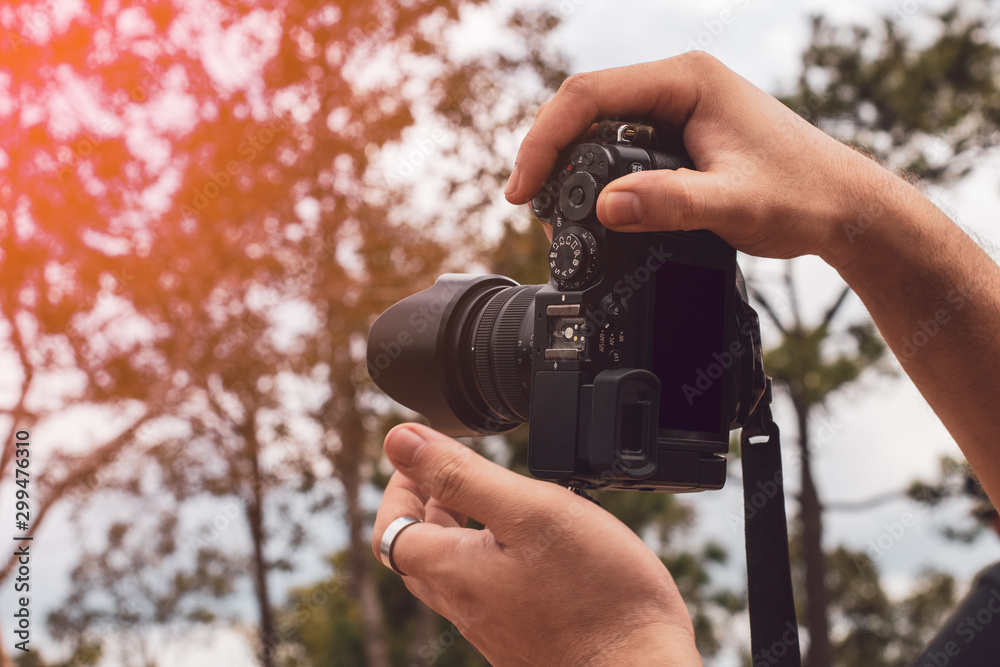 man holding camera to take a photo in nature forest lanscape background, adventure trip tourism, holiday vacation with backpack travel to moutain