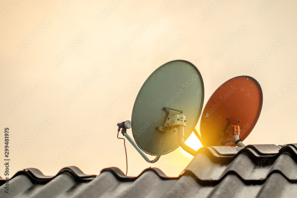 The satellite dishes on the roof for digital TV reciever with the sun light flare in the afternoon or evening.
