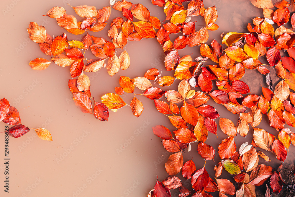 Red and orange autumn leaves floating in red and orange water, surreal abstract autumn background