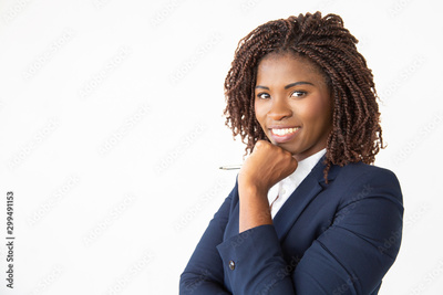 Happy successful business trainer holding pen, looking at camera, smiling. Young African American business woman standing isolated over white background. Corporate training concept